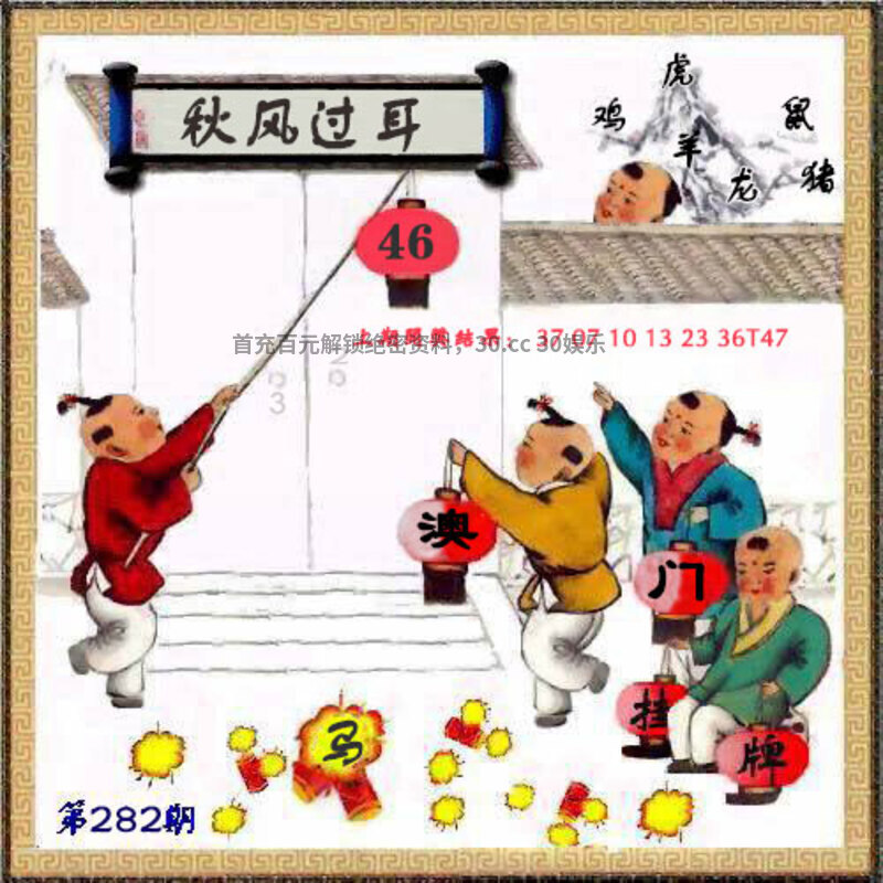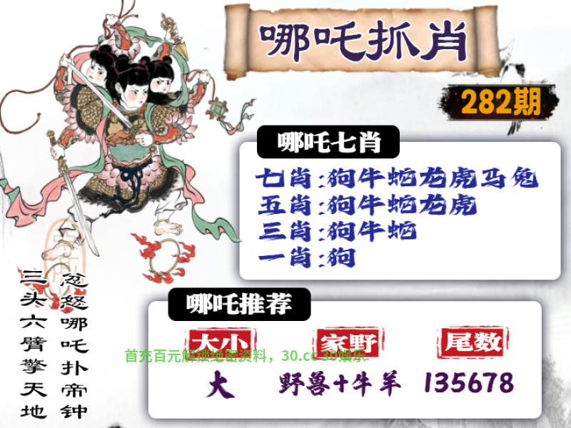 282期: ①七肖中特:狗牛蛇龙虎马兔 ②大小中特:大数 ③家野+2肖:野兽+牛羊 ④精准六尾:135678 |